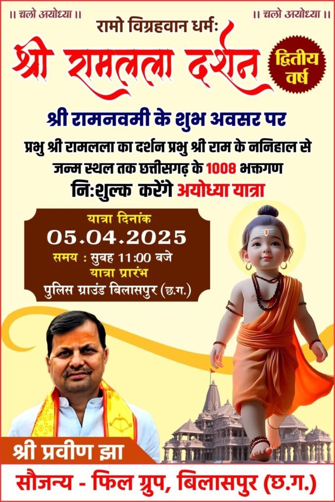 बिलासपुर। अयोध्या धाम में मर्यादा पुरुषोत्तम प्रभु श्री रामलला की प्राण प्रतिष्ठा के पश्चात देशभर में भक्तों का उत्साह अद्वितीय है। रामनगरी के दिव्य दर्शन की पावन अभिलाषा को साकार करने बिलासपुर के प्रसिद्ध समाजसेवी एवं उद्योगपति प्रवीण झा ने एक अनूठी पहल की है। हर वर्ष 1008 श्रद्धालुओं को श्रीराम दरबार की मंगलमयी यात्रा कराने का संकल्प लेते हुए, इस वर्ष वे 21 भव्य बसों की व्यवस्था कर रहे हैं। यह यात्रा पूर्णतः निःशुल्क होगी। जिसमें श्रद्धालुओं के लिए प्रसाद रूपी भोजन, नाश्ता, अयोध्या में ठहरने की सुविधा तथा दर्शन के उपरांत सुरक्षित वापसी की संपूर्ण व्यवस्था उनकी सेवा भावना से ओतप्रोत टीम द्वारा की जाएगी।