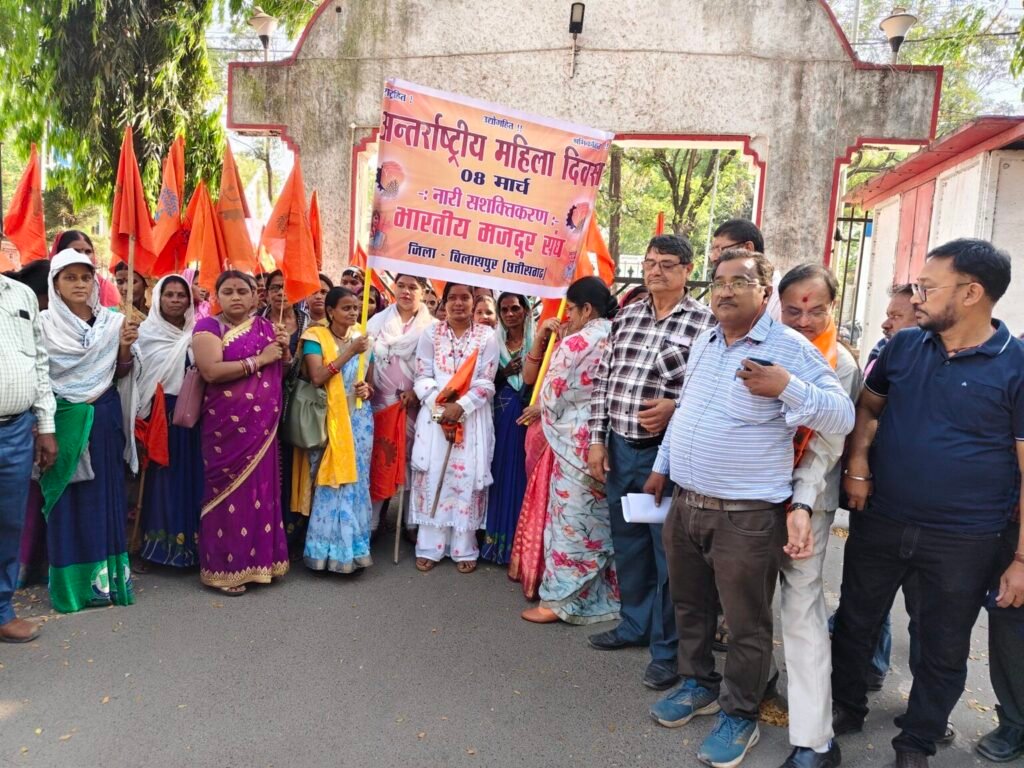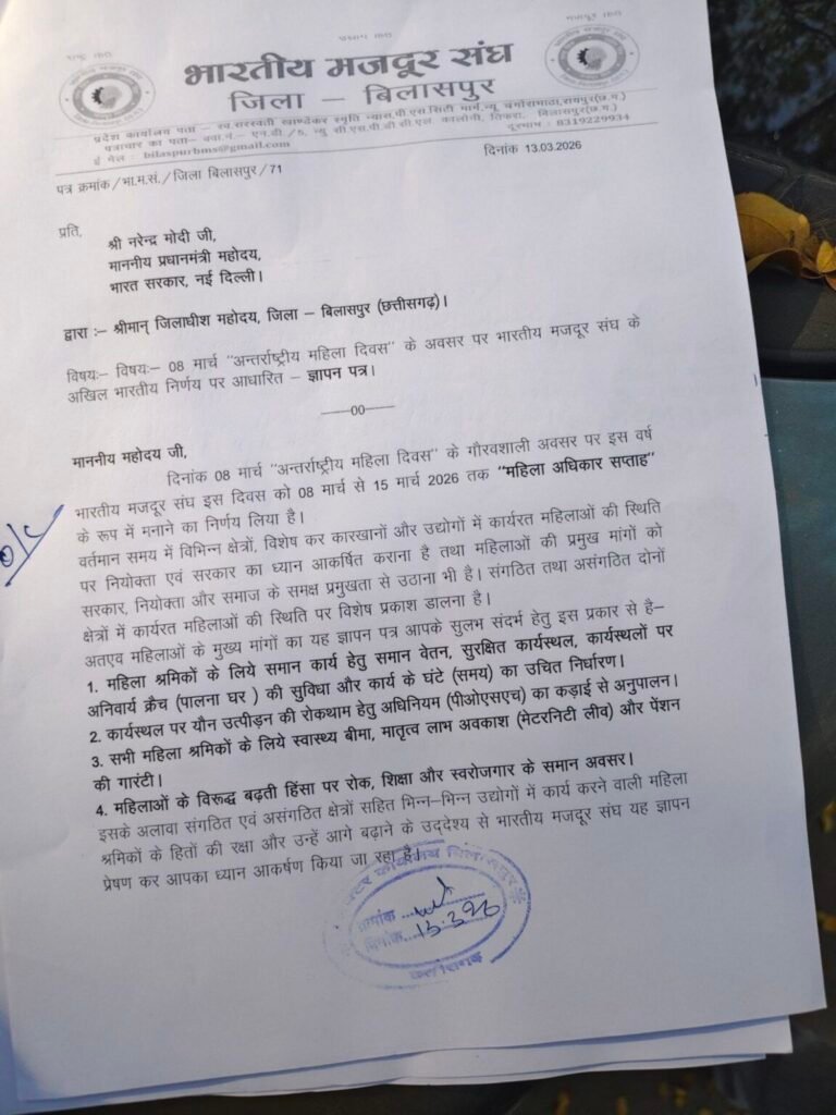 बिलासपुर। महिला श्रमिकों के अधिकारों और कार्यस्थलों पर उनकी सुरक्षा को लेकर बिलासपुर में भारतीय मजदूर संघ की जिला इकाई ने जोरदार तरीके से आवाज उठाई। अंतरराष्ट्रीय महिला दिवस के अवसर पर संगठन ने इस वर्ष 8 मार्च से 15 मार्च 2026 तक “महिला अधिकार सप्ताह” मनाने का निर्णय लिया है। इसी क्रम में भारतीय मजदूर संघ के पदाधिकारियों और महिला श्रमिकों ने प्रशासन के नाम ज्ञापन सौंपकर महिला श्रमिकों से जुड़ी समस्याओं और उनकी मांगों को प्रमुखता बताया।